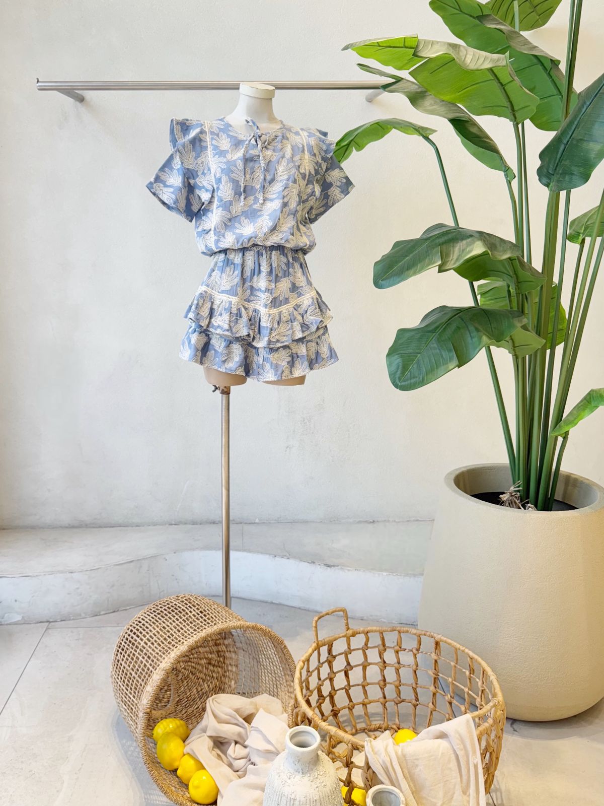 Descripción: Mini de tiro alto. Cintura elástizada. Detalle de bajo con volados.