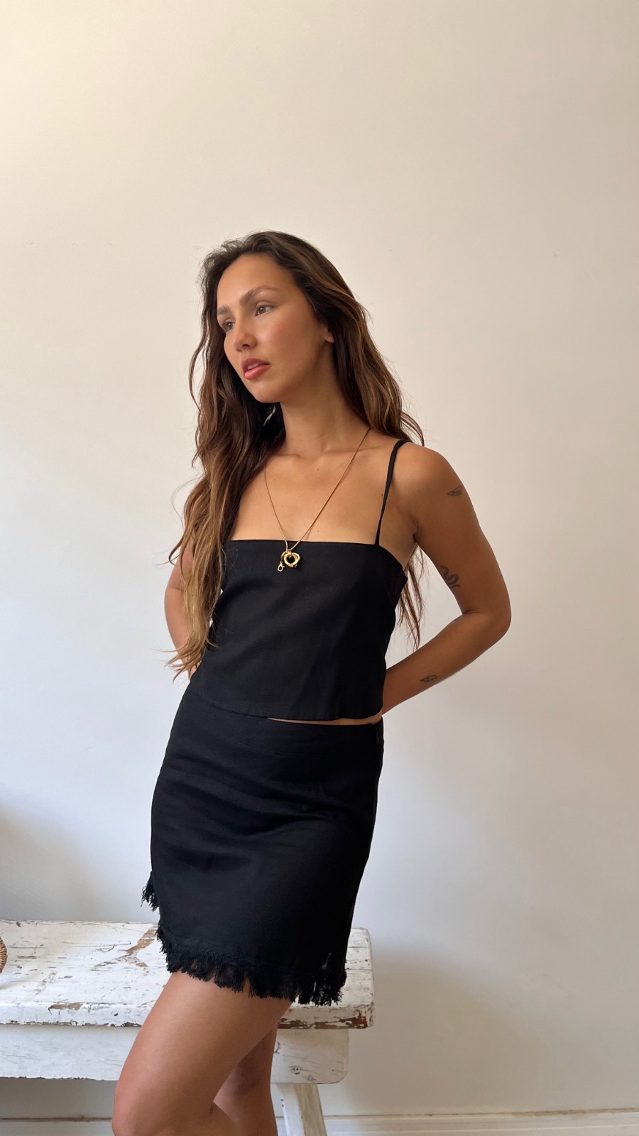 Descripción: mini de tiro alto con cierre metálico lateral. Detalle de puntilla con flecos en bajo.
