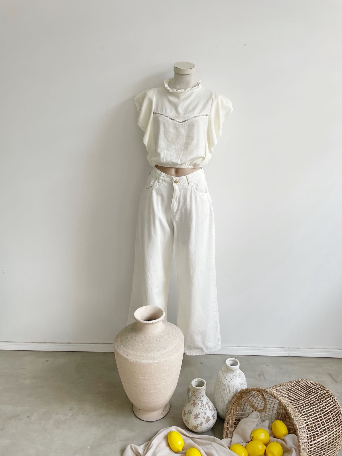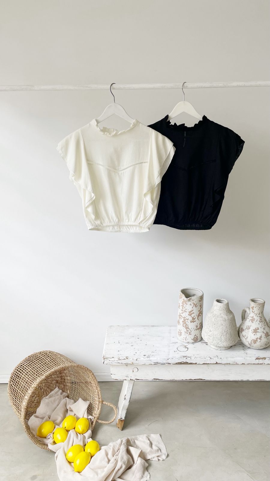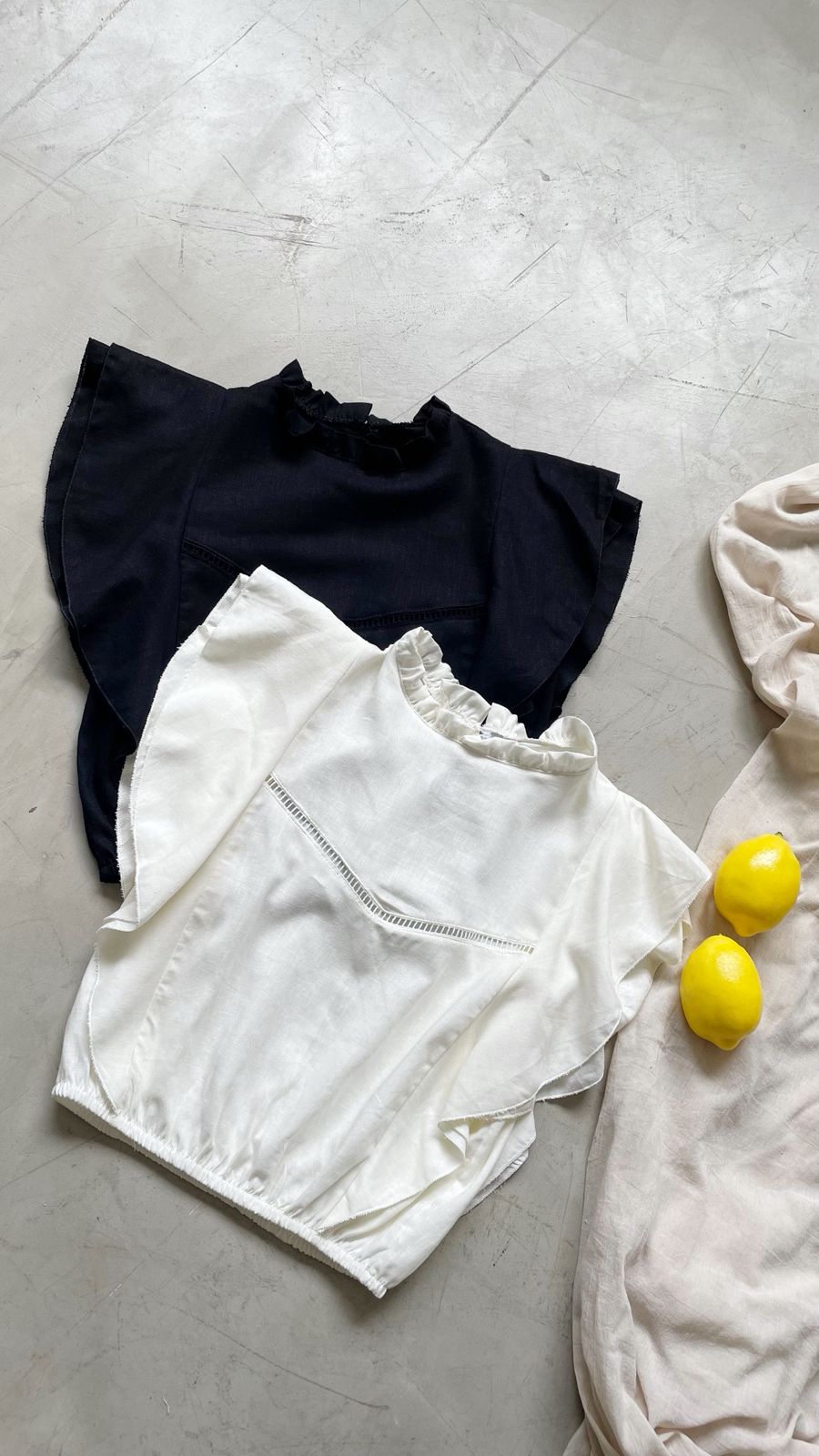 Descripción: blusa de cuello redondo. Detalle de volantes delantero de la misma tela. Detalle de cordón. Mangas largas.