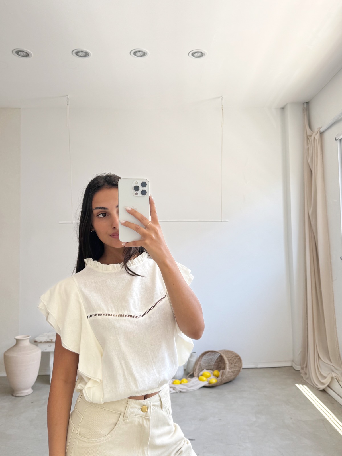 Descripción: Musculosa de cuello subido. Bajo acabado en elástico. Boton en parte trasera.