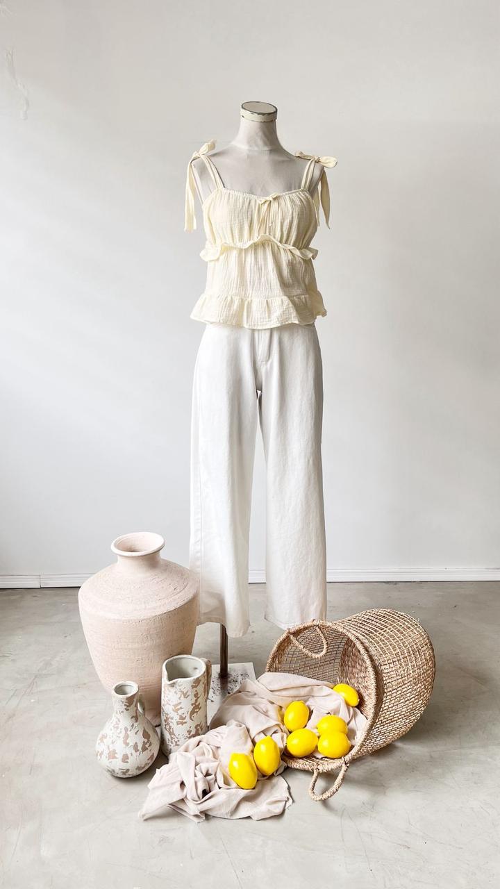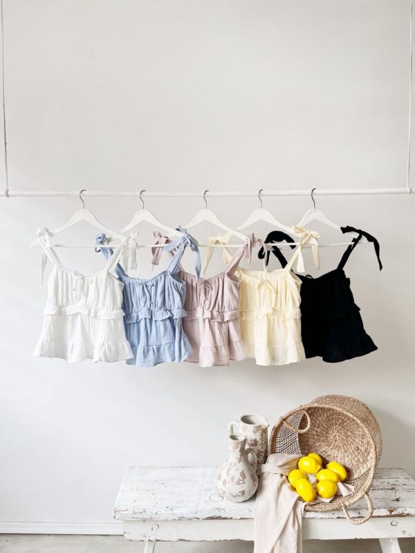 Descripción: Musculosa de escote recto. Forro interior en busto combinado a tono. Moño delantero decorativo. Bajo acabado en volantes.