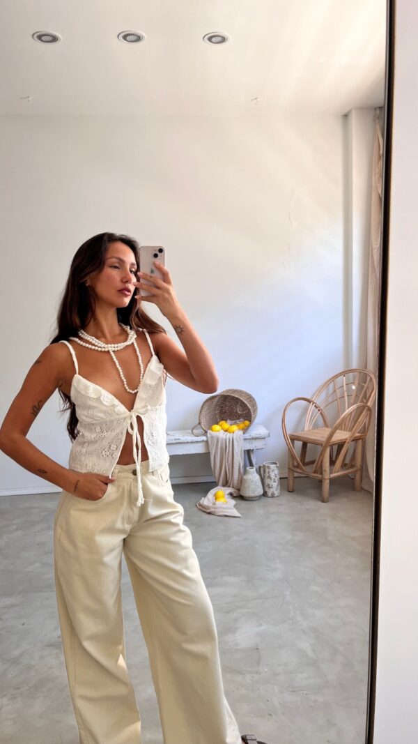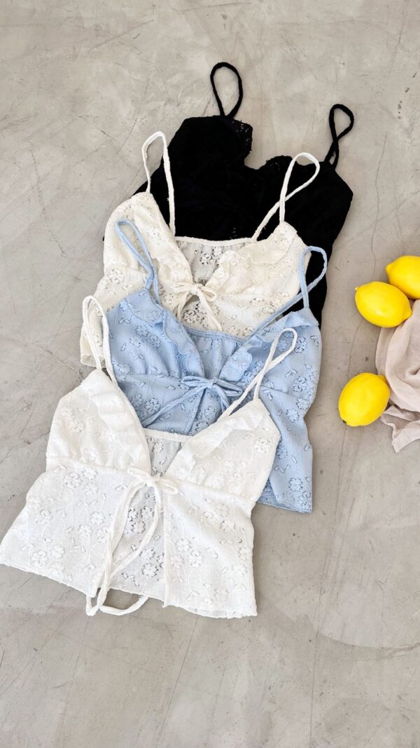 Descripción: Musculosa de escote pico y tirantes finos. Moño delantero regulable. Detalle de volados en busto.