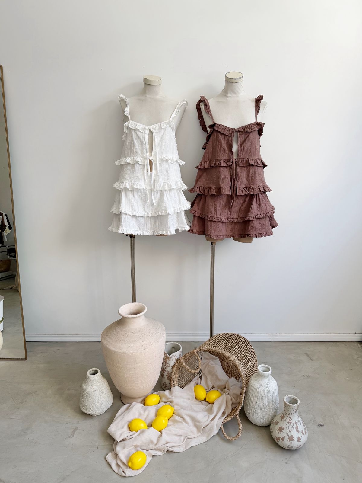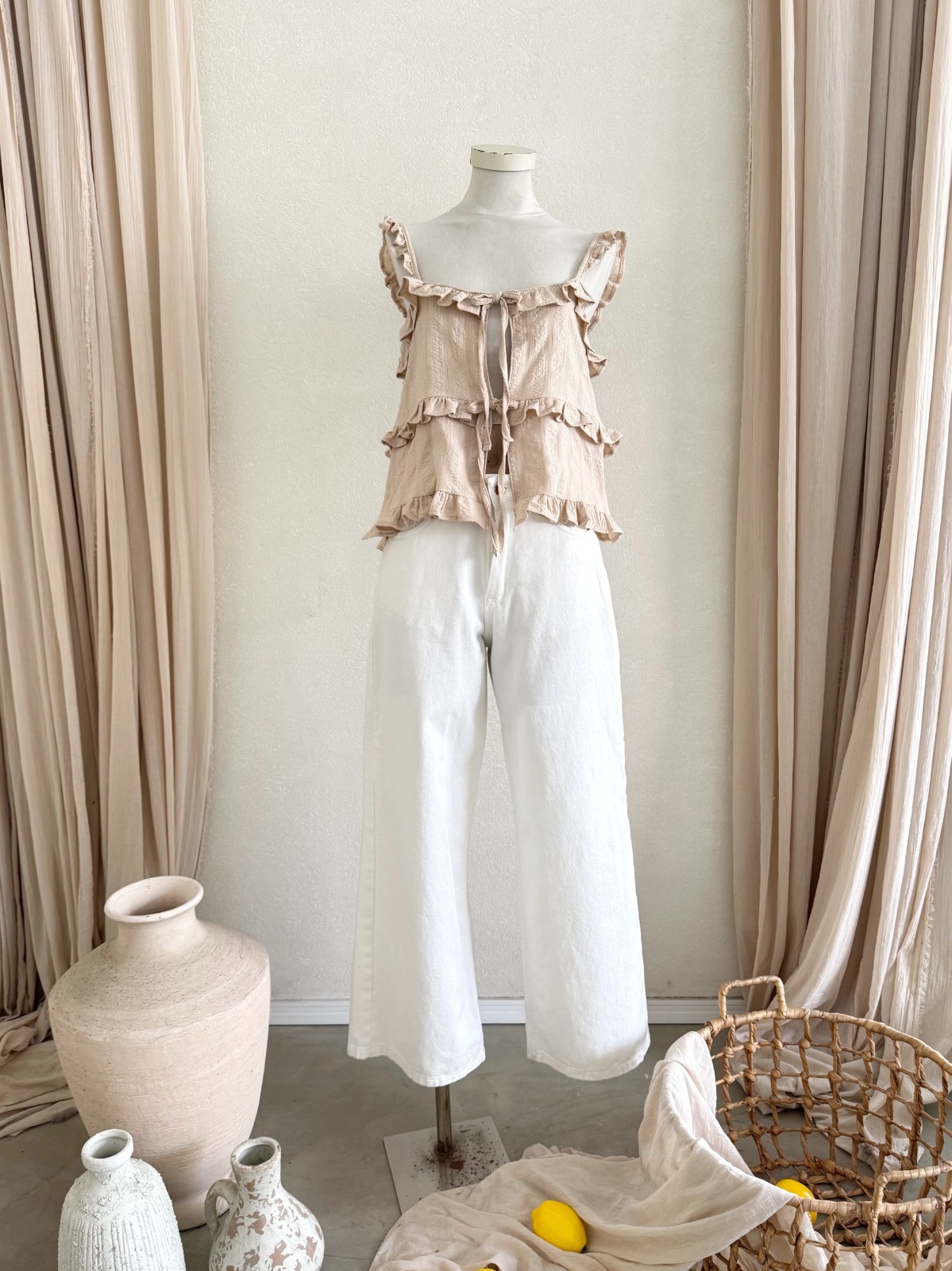 Descripción: Musculosa con tirantes. Detalles de volados en terminaciones. Moños delanteros decorativos.