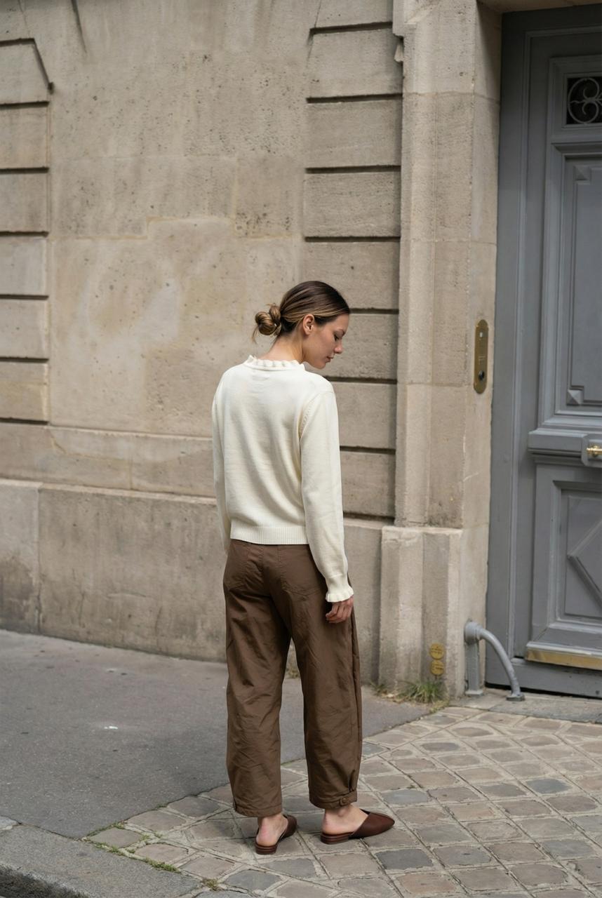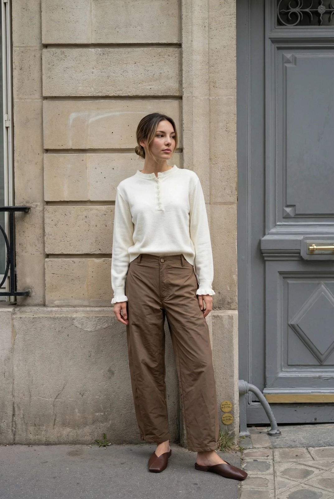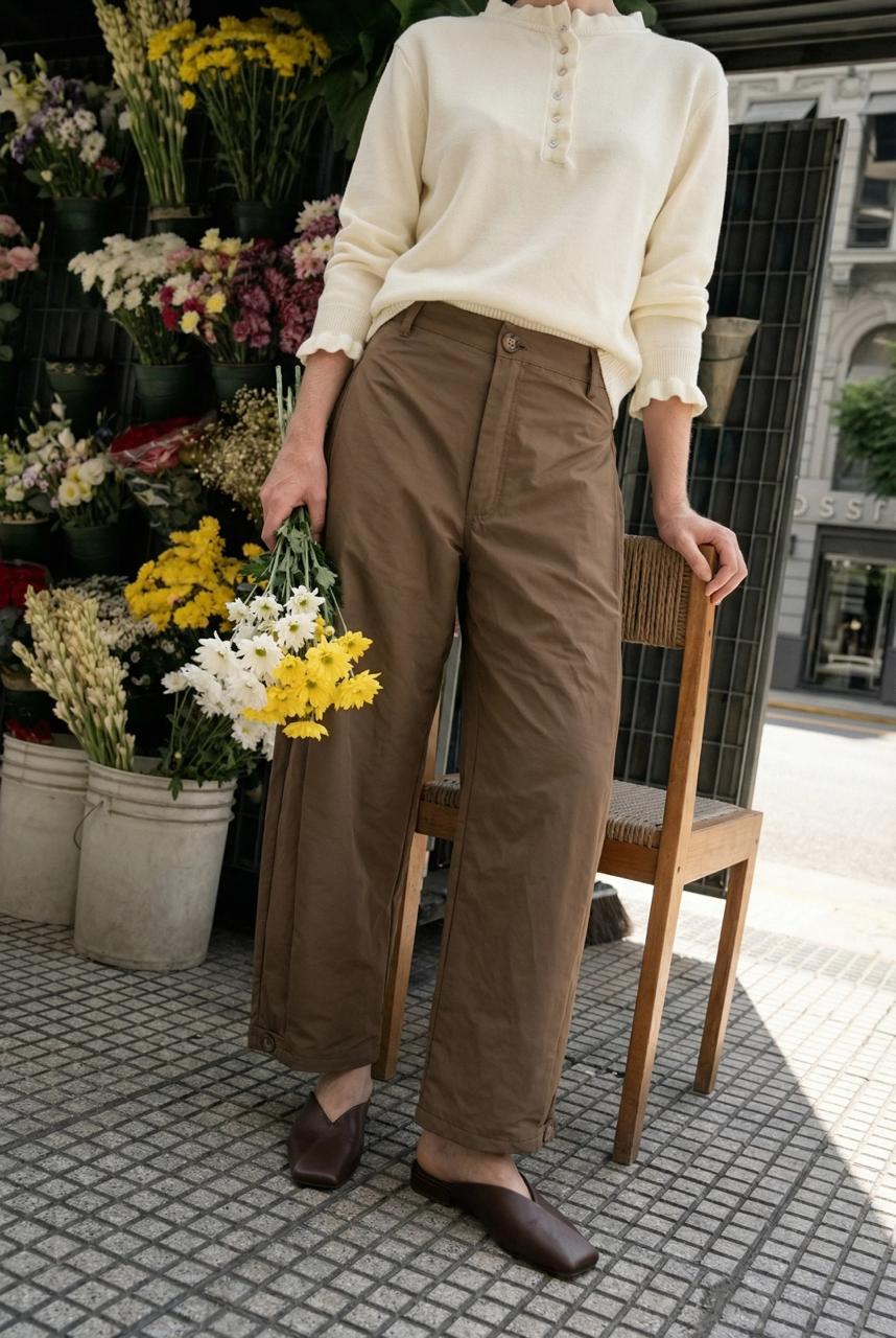Descripción: Pantalón de tiro alto recto .Cierre frontal con cremallera y botón. Detalle de bajo con botones decorativos.