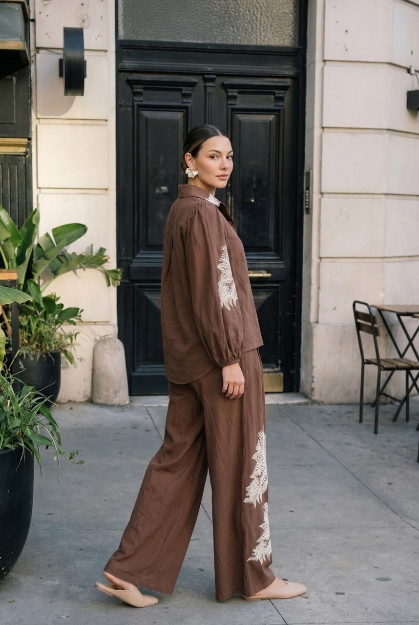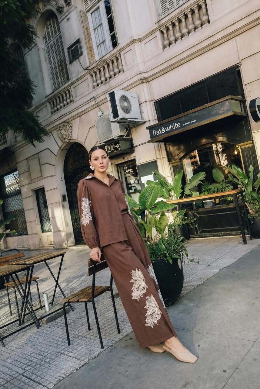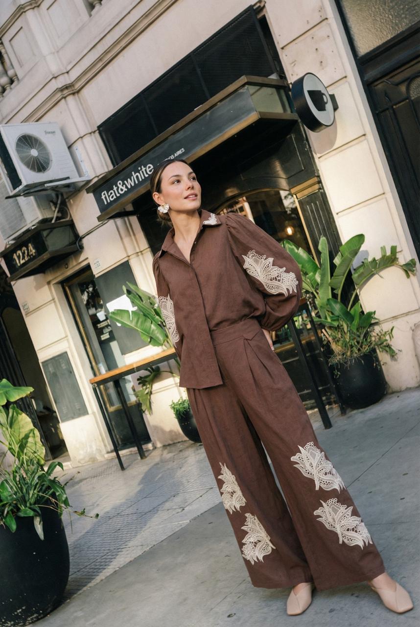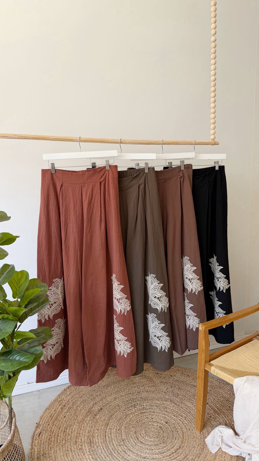 Descripción: Pantalón de tiro alto con cintura elástica en parte trasera. Detalles de pinzas en delantero. Pierna ancha. Terminaciones con aplicaciones bordadas.