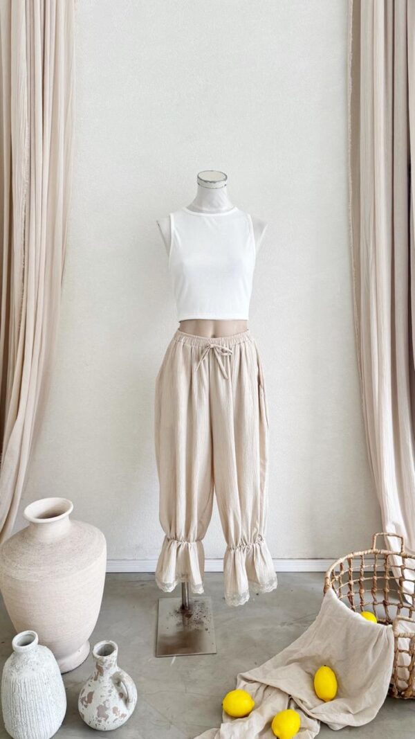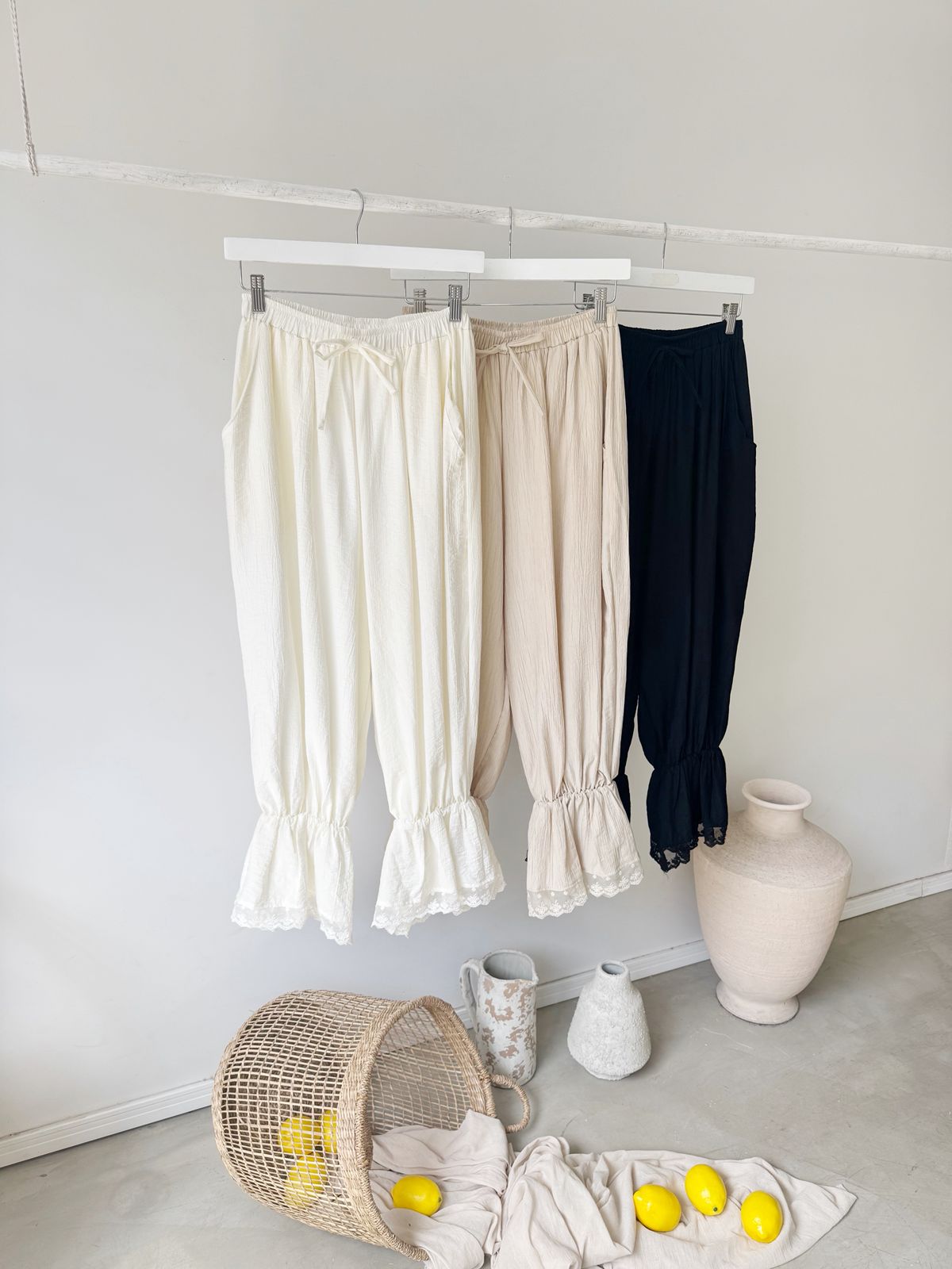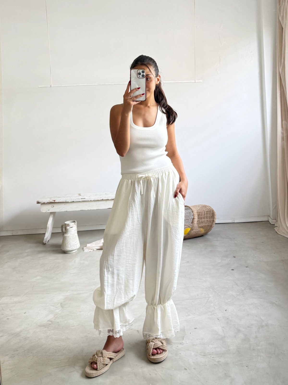Descripción: Pantalón corte aladin con cintura elástizada. Detalle de cordón decorativo. Bajo con elástico interior y terminación de puntilla