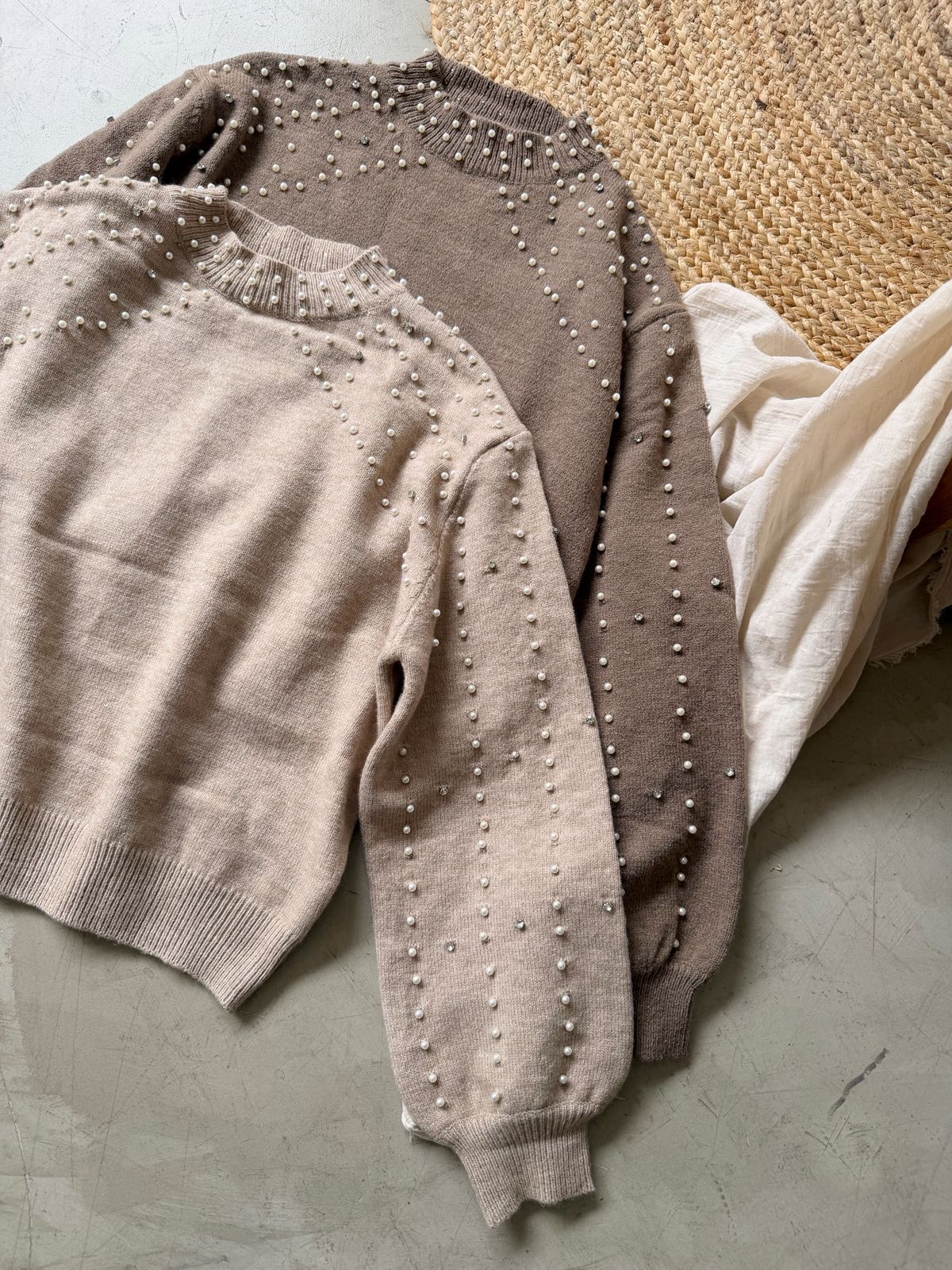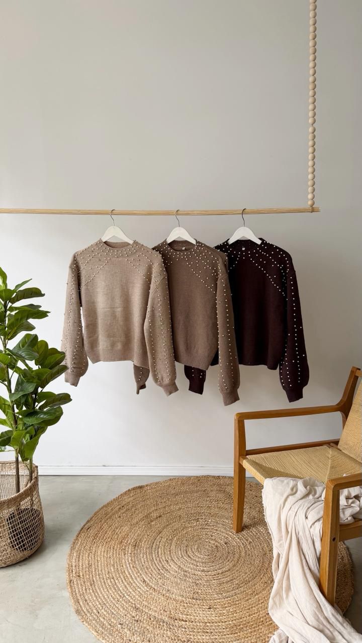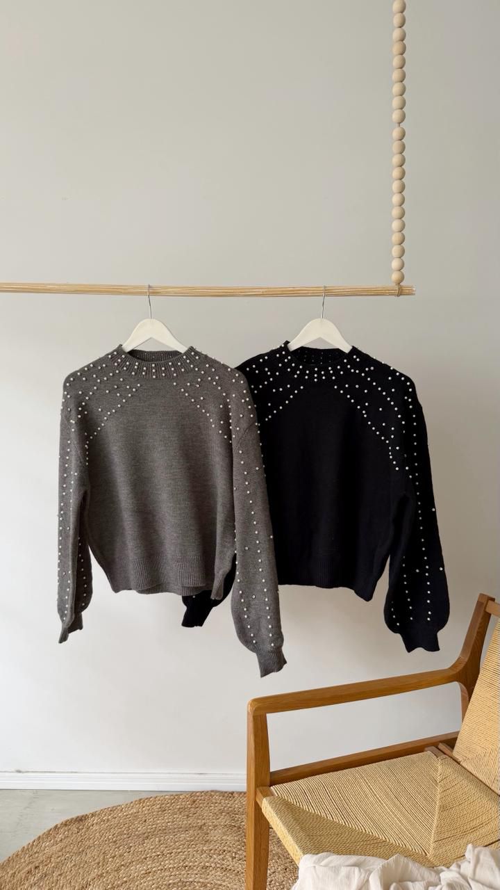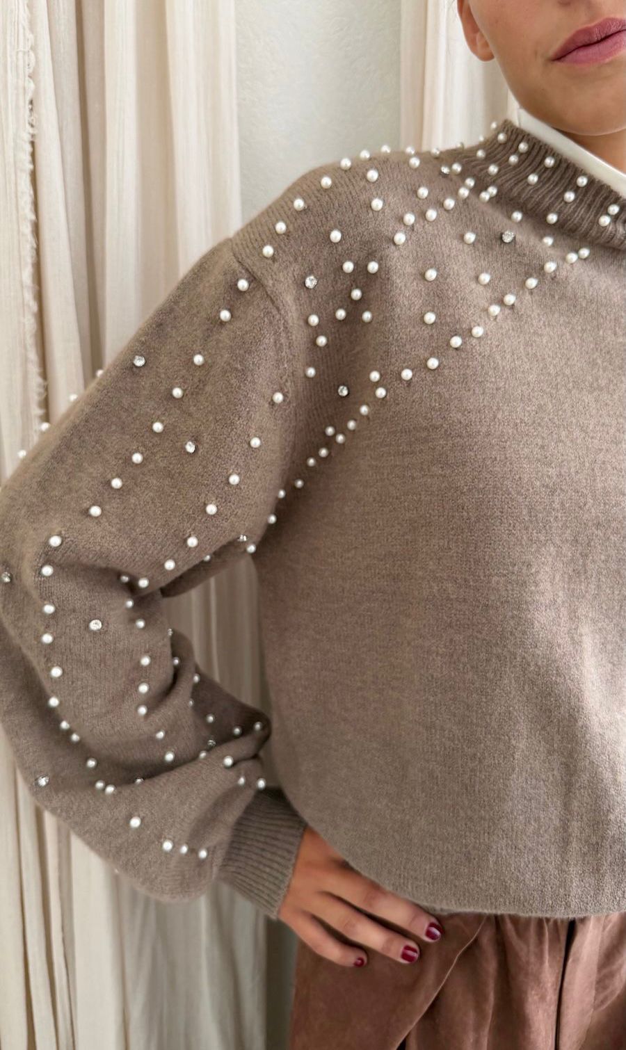 Descripción: Sweater de cuello redondo y mangas largas terminadas en puño. Detalles de perlas y brillos.
