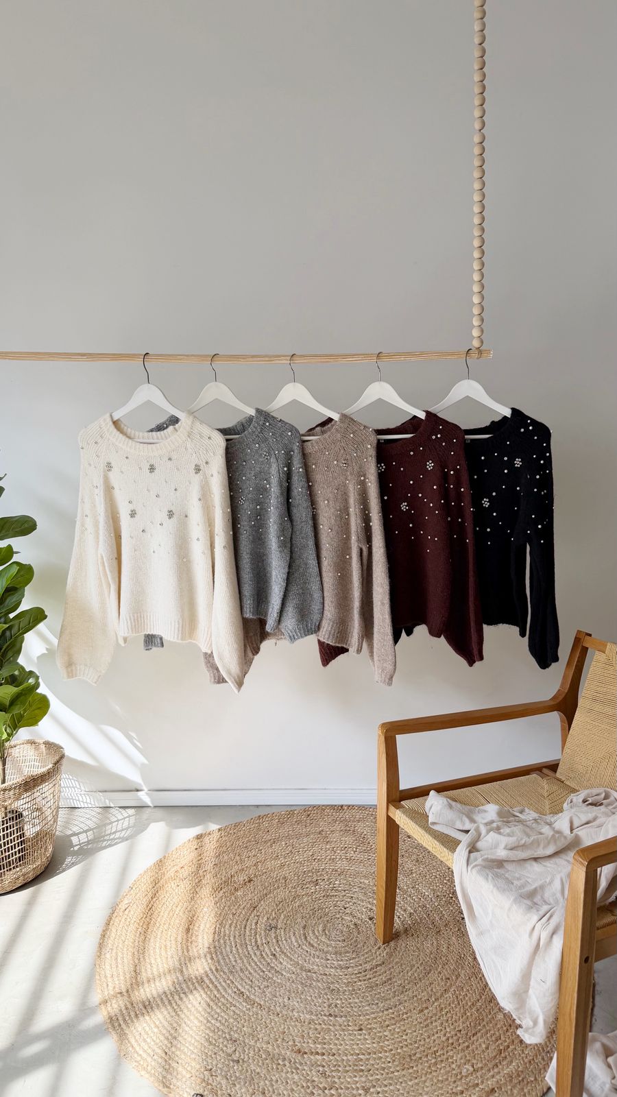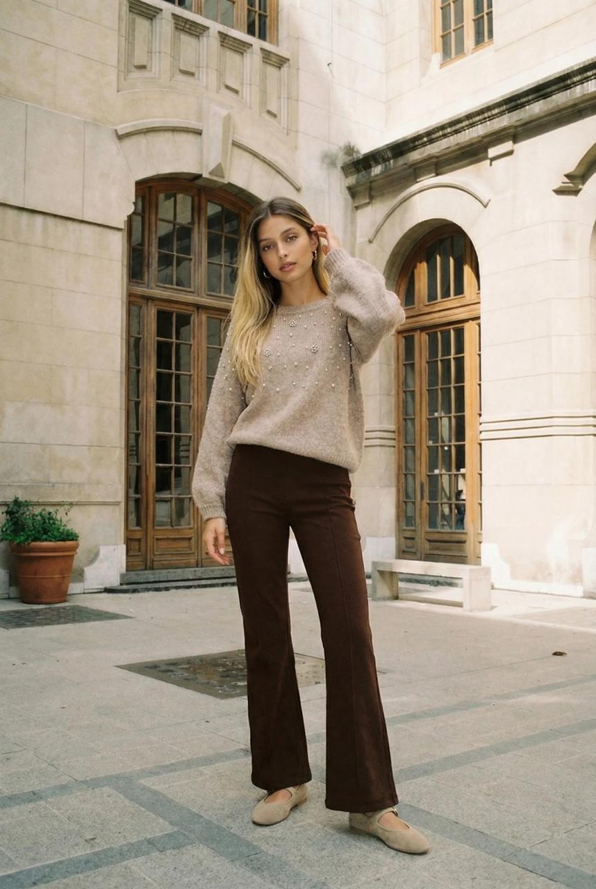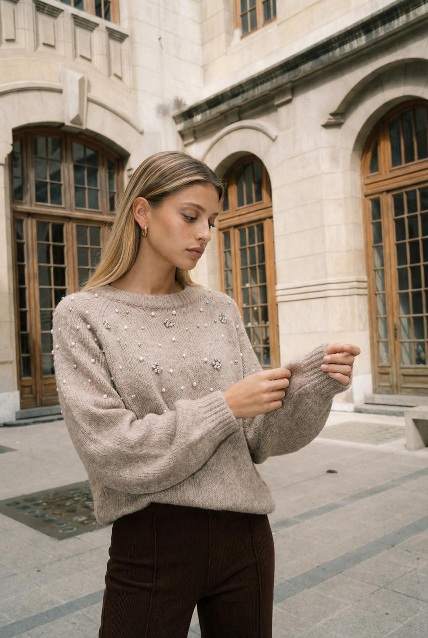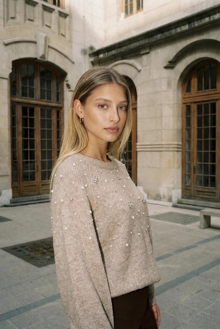 Descripción: Sweater de cuello redondo. Mangas largas terminadas en puño. Detalle de perlas y strass.