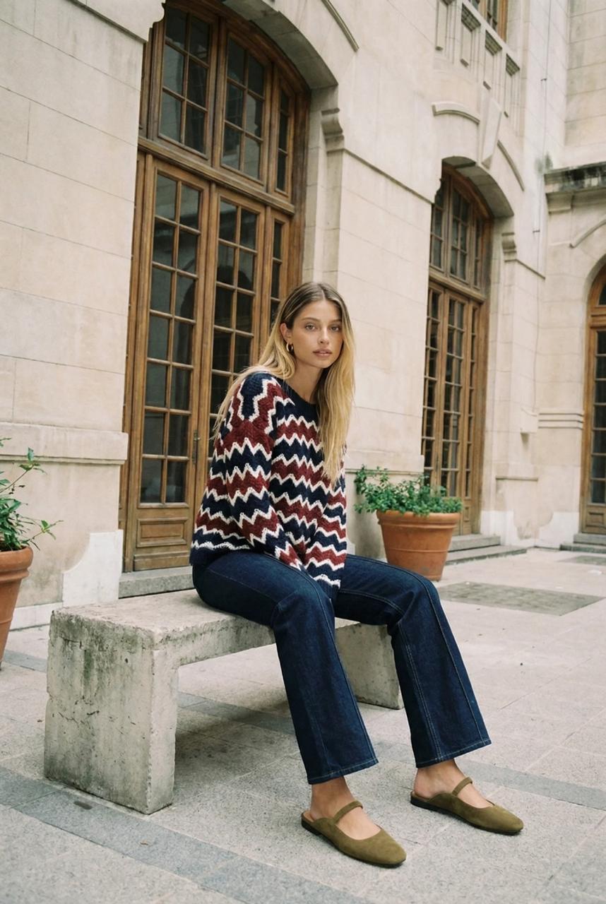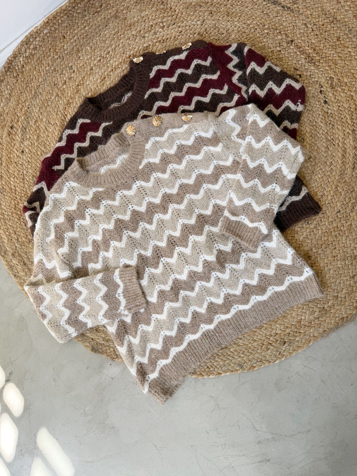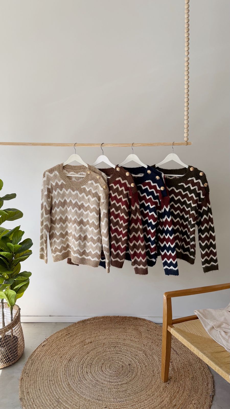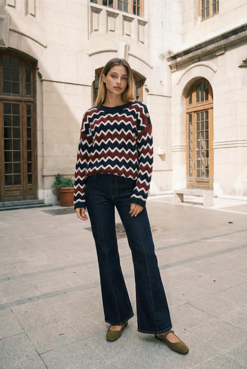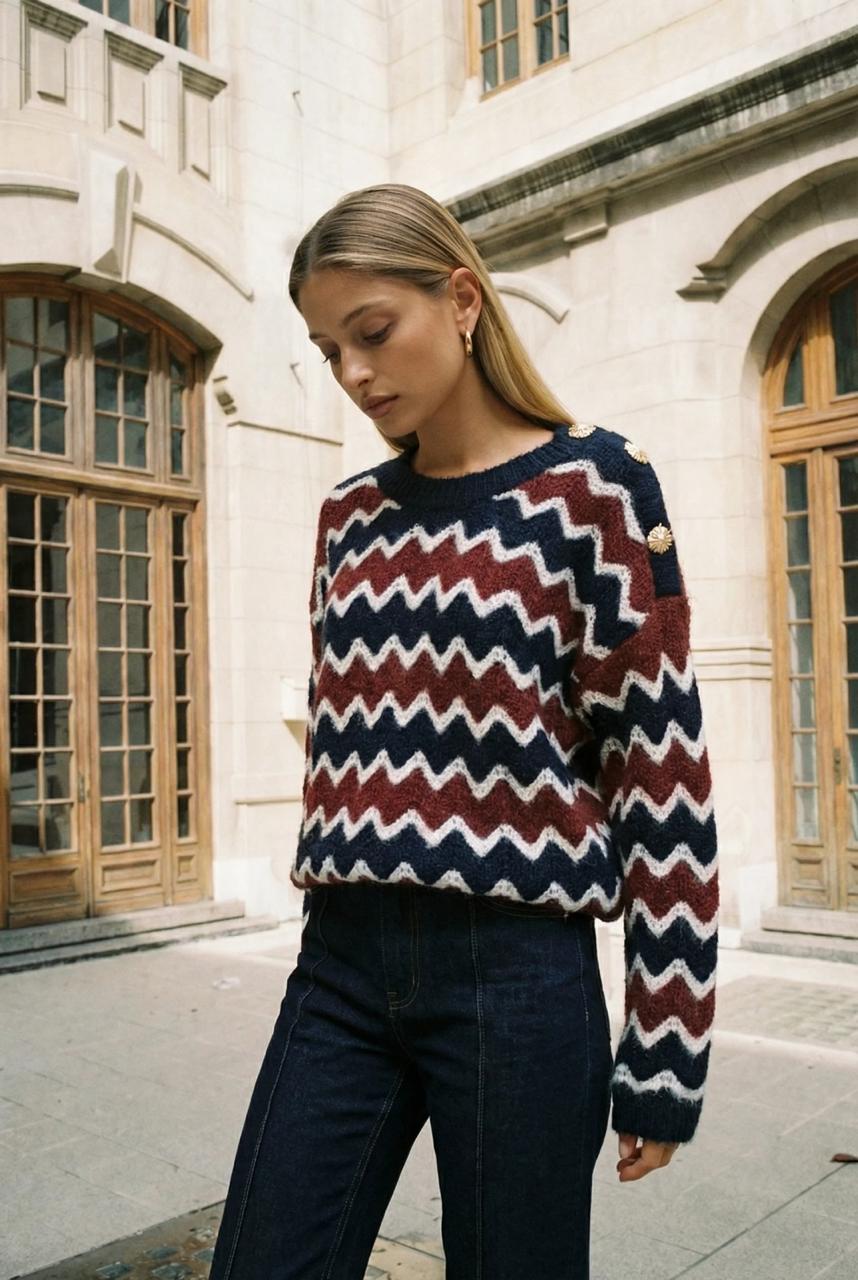 Descripción: Sweater de cuello redondo y mangas largas. Detalle de zigzag. Botones dorados en lateral.