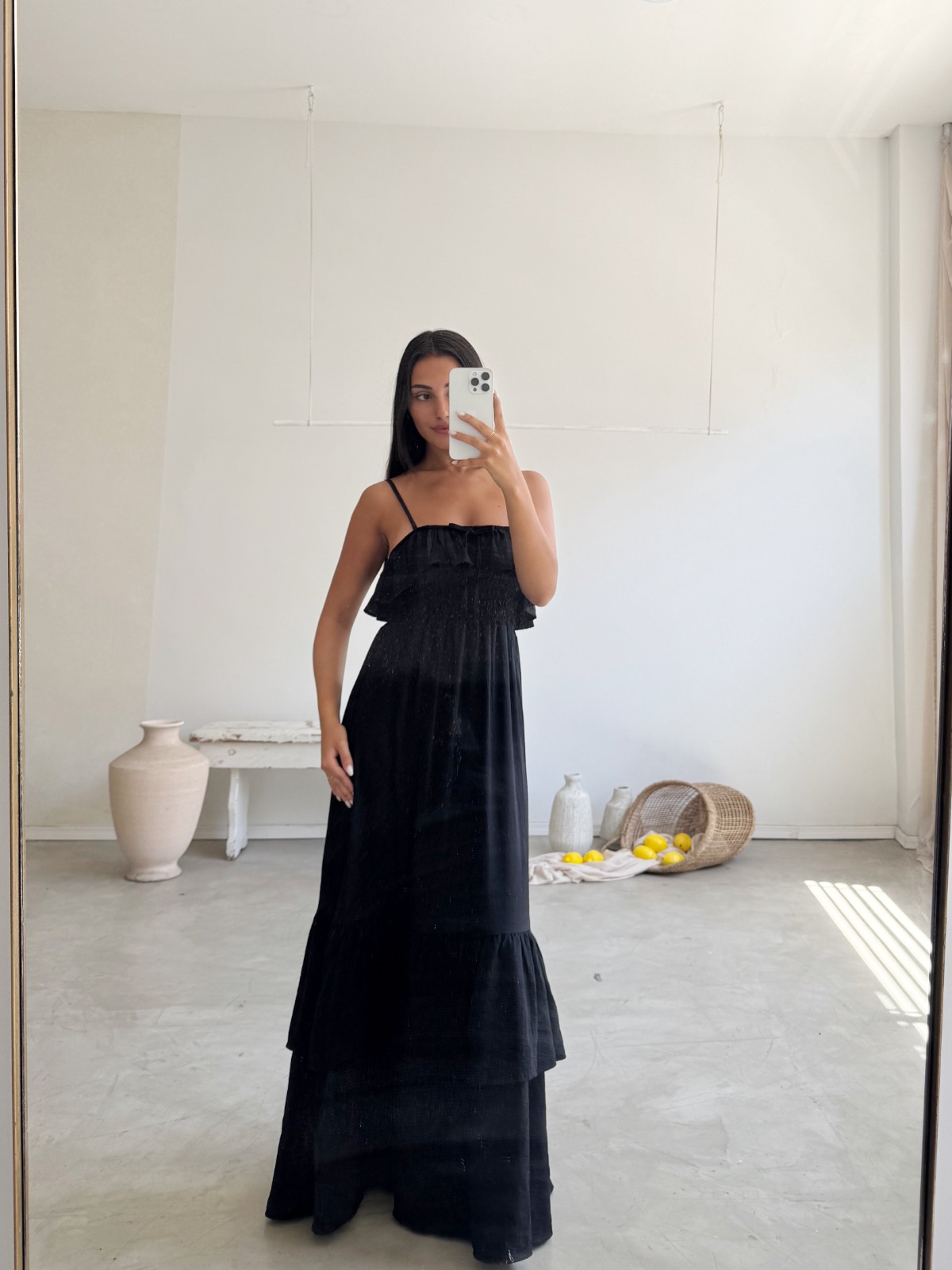 Descripción: Vestido largo con tirantes finos. Detalles de volados en busto y bajo. Moño decorativo en delantero.
