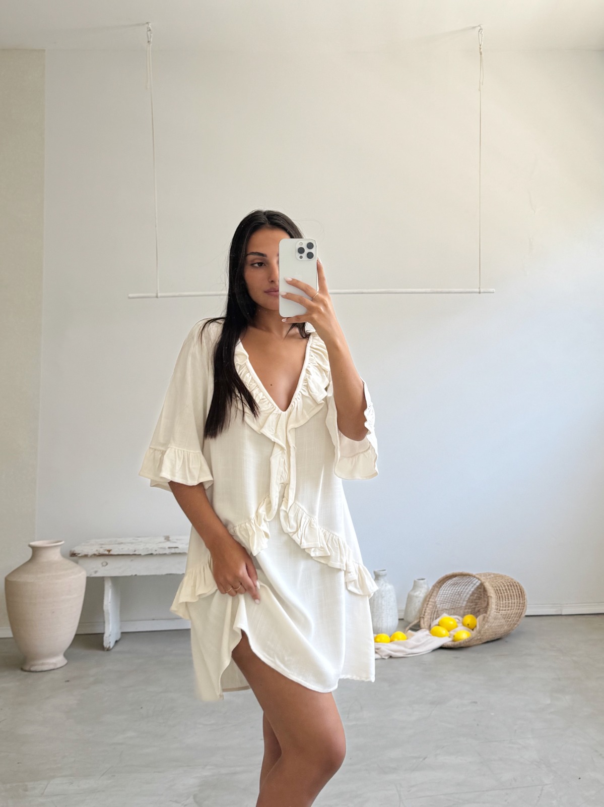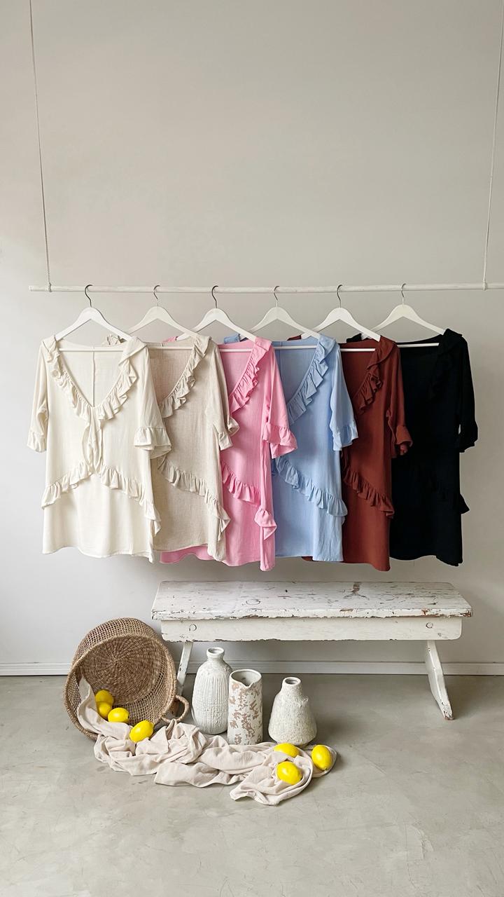 Descripción: Vestido corto con cuello pico. Mangas cortas. Detalles de terminaciones acabadas en volados.
