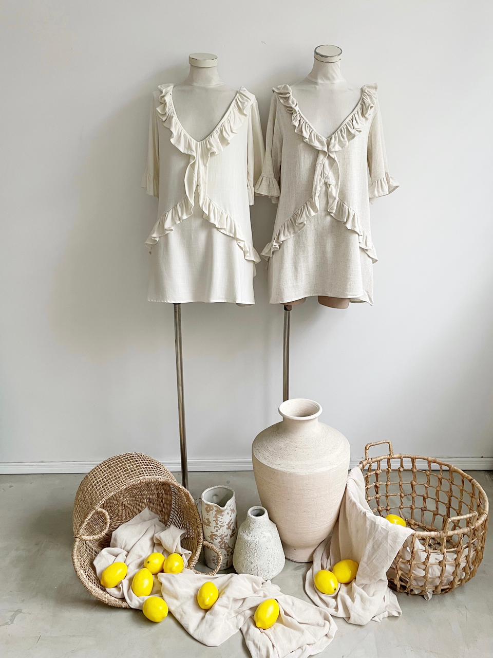 Descripcion: Vestido con hilo elastico en cintura. Tira para atar en escote.