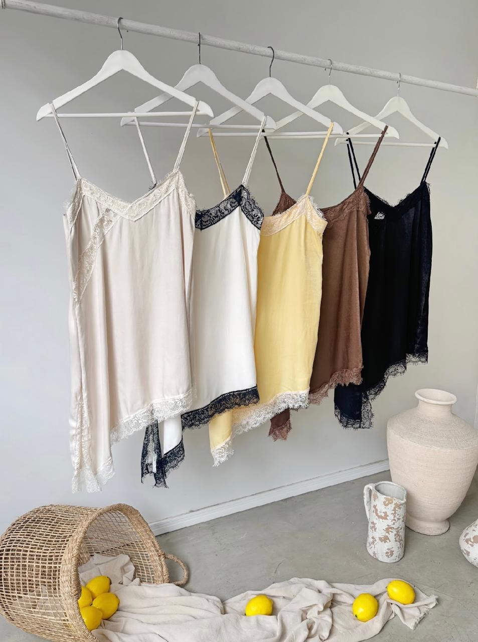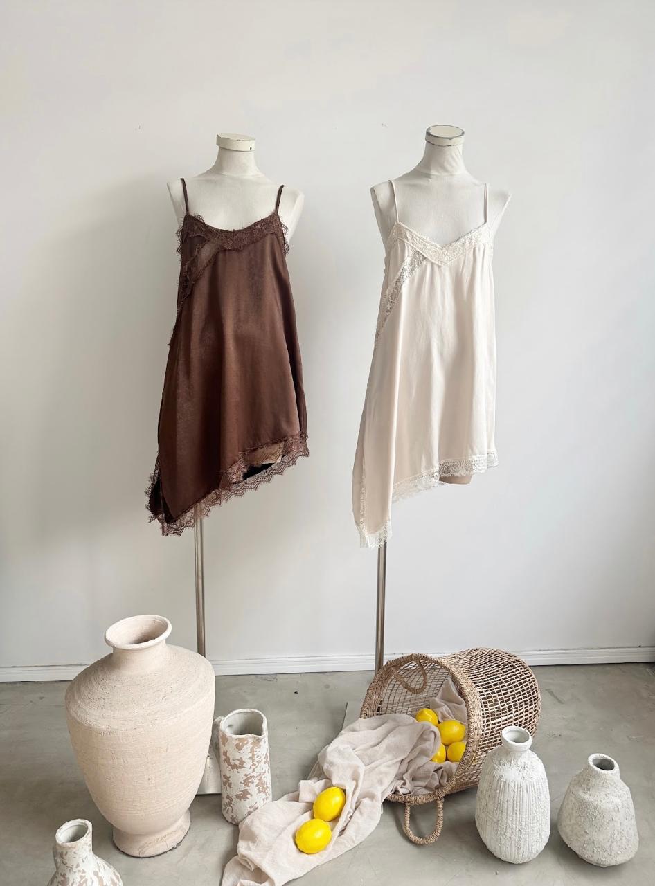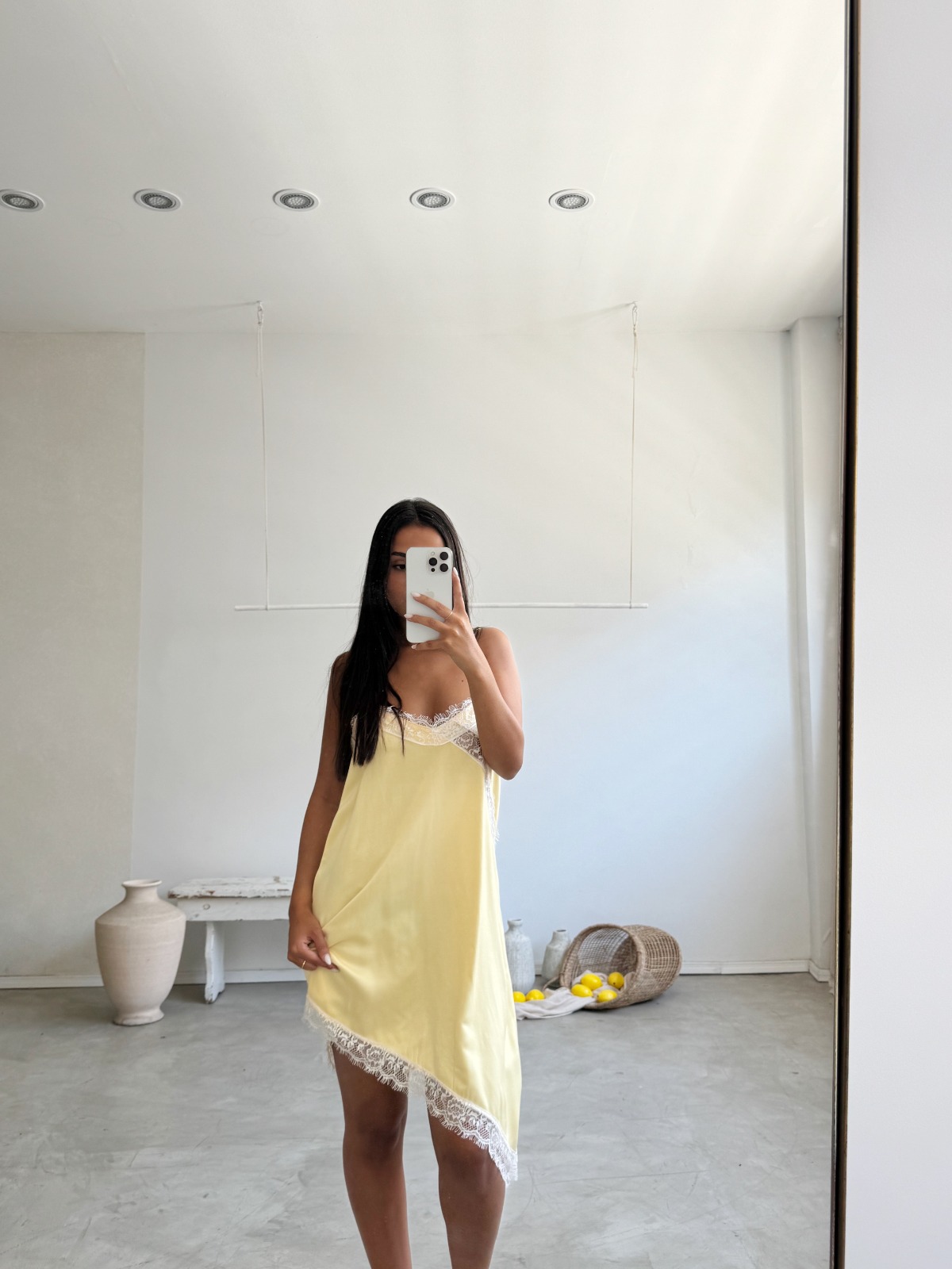 Descripción: Vestido Lencero corto de escote pico y tirantes finos. Bajo asimétrico. Detalle de aplicación de puntilla a tono.