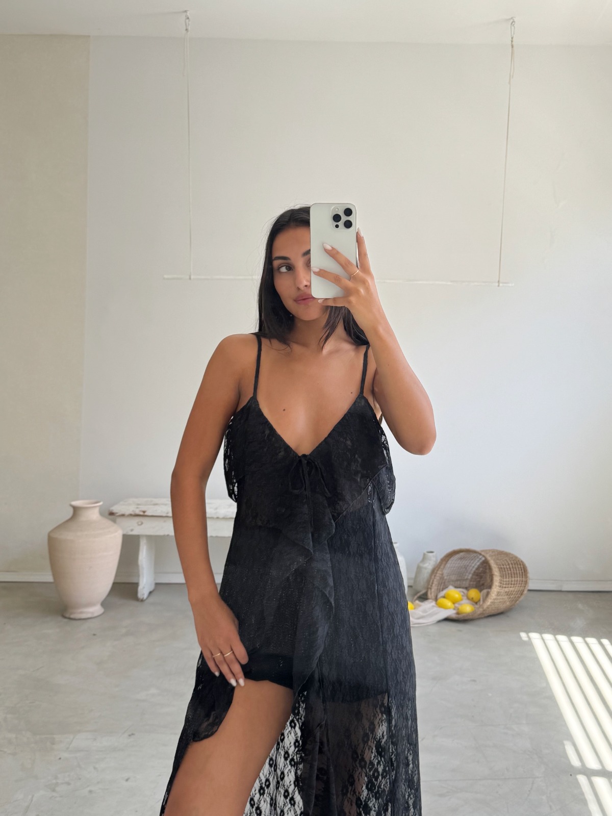 DESCRIPCION: VESTIDO DE ENCAJE NEGRO CON VOLADOS EN TERMINACION ROULOTTE.