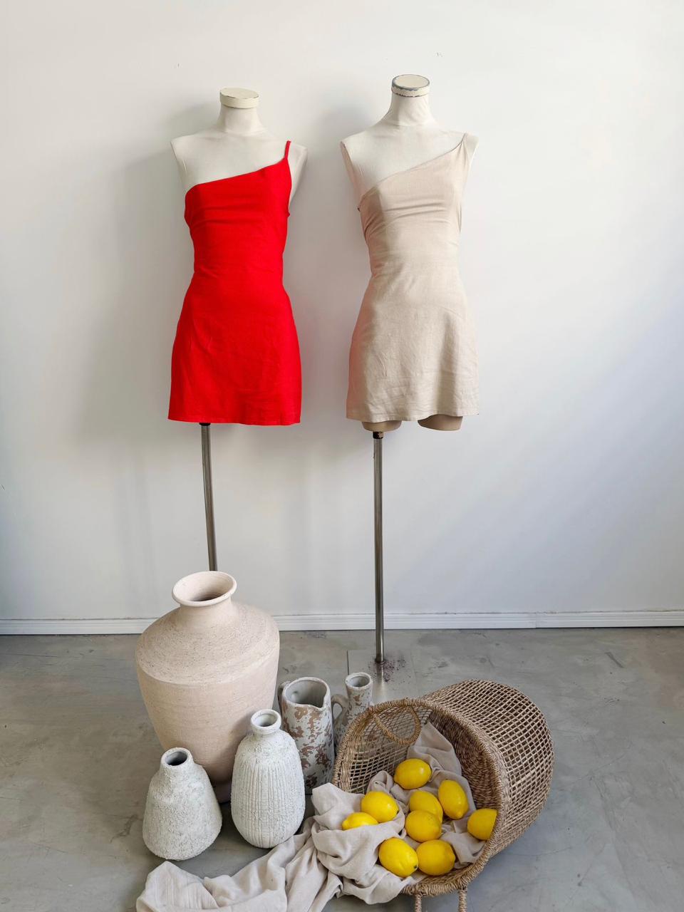Descripcion: Vestido corto con botones delanteros. detalle trasero de cinto para atar. Bolsillos delanteros.
