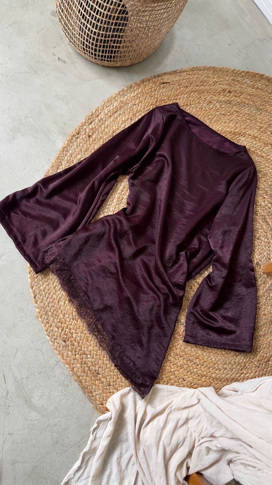 Descripción: blusa de cuello redondo. Detalle de volantes delantero de la misma tela. Detalle de cordón. Mangas largas.