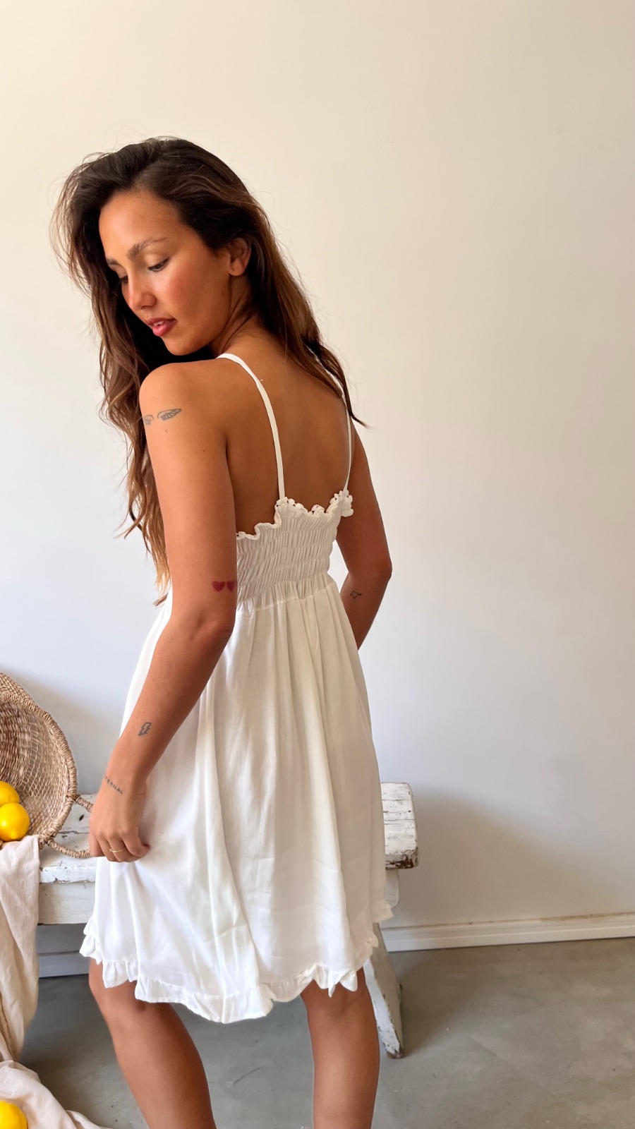 Descripción: Vestido corto. Detalle en terminaciones con puntilla. Bajo acabado en volados. Busto forrado a tono.