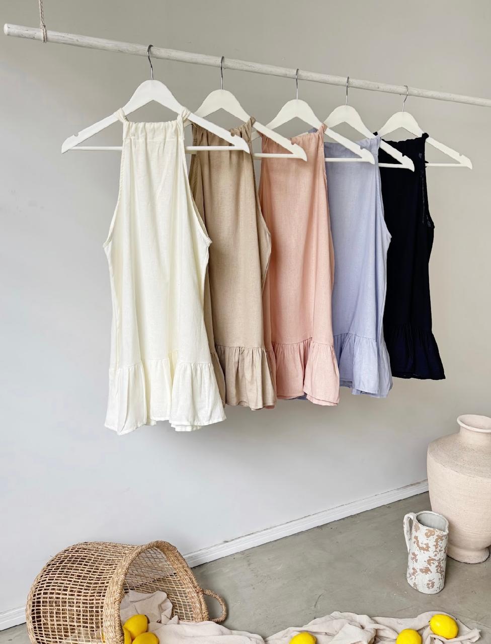 Descripción: Vestido corto de cuello recto subido con cordón ajustable. Bajo acabado en volados.