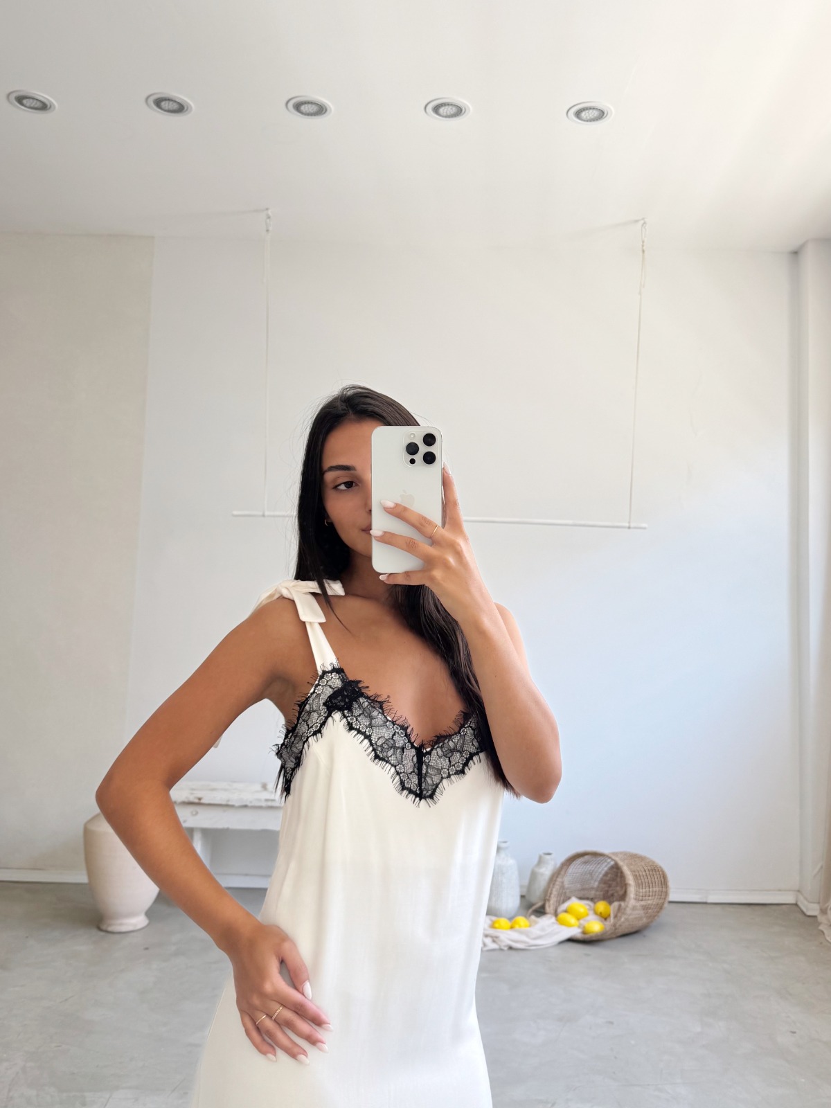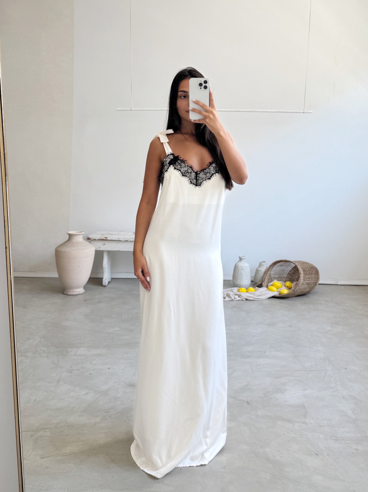 Descripción: Vestido largo de escote pico y tirantes para atar. Detalle de aplicación de encaje.