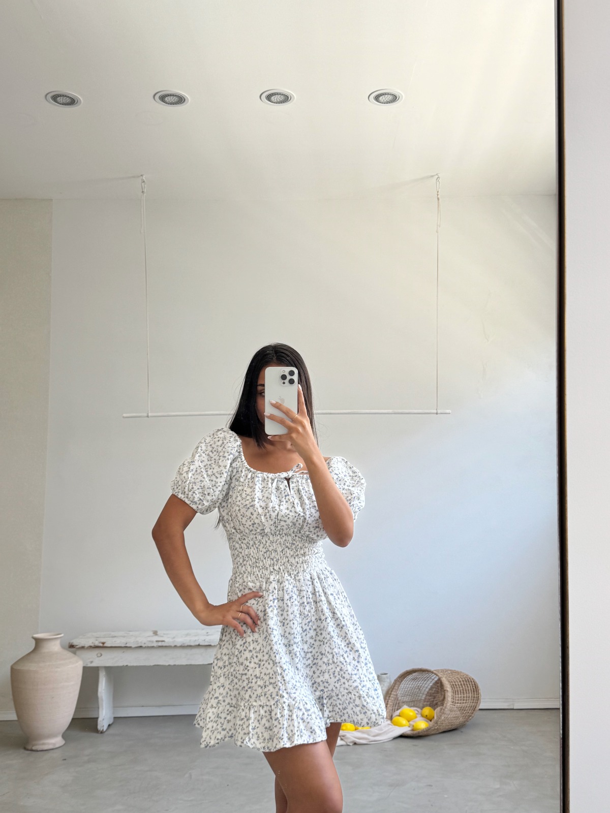 Descripción: Vestido estampado de escote recto ajustable. Manga corta abullonada. Cintura elástica. Detalle de volado en bajo.