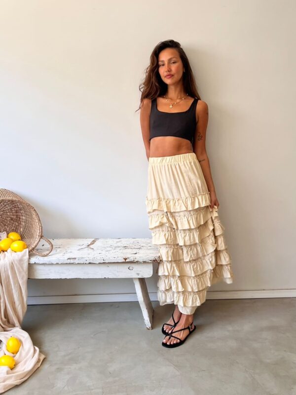 $29,000Descripción: Falda larga con cintura elástica. Bajo acabado en volantes.