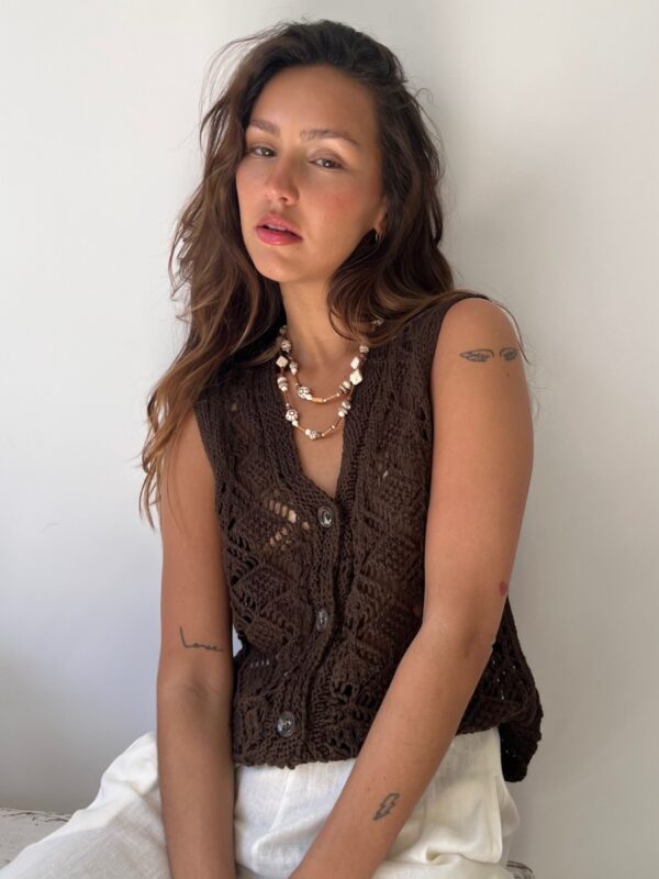 $22,000Descripción: Chaleco tejido escote pico y manga sisa. Cierre frontal con botones combinados a tono.