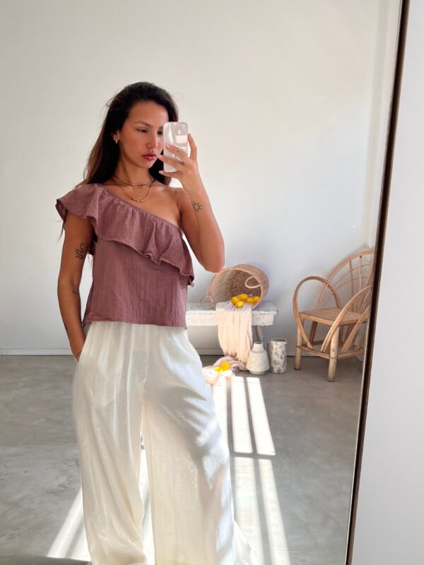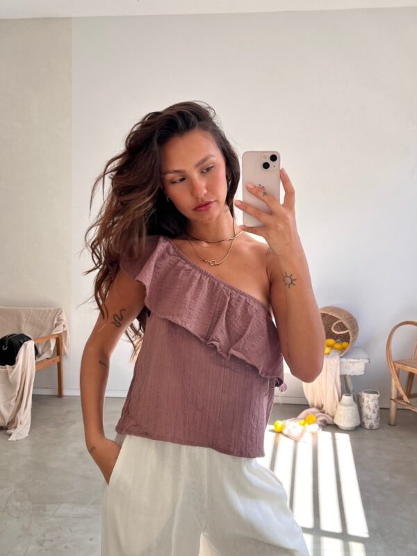 $13,000Descripción: Blusa de un solo hombro con detalle de volado del mismo textil.