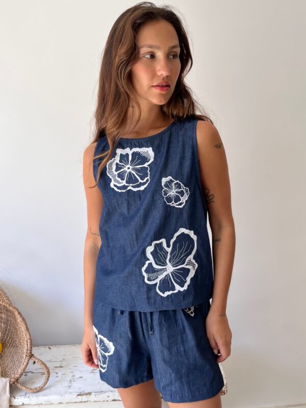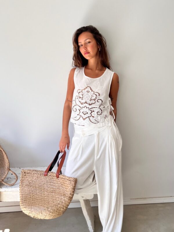 $23,500Descripción: Musculosa de cuello redondo. Tiras para atar en laterales. Detalle de bordado y calado.