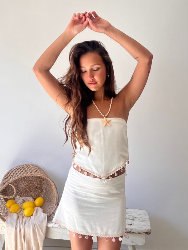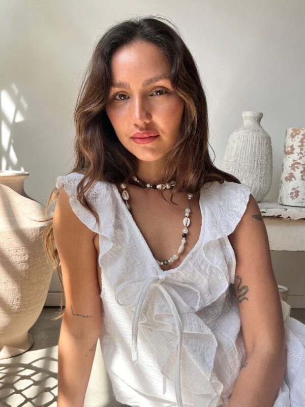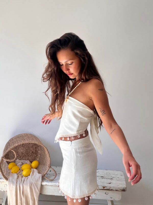 $15,000Descripción: Top con lazo para atar en espalda ajustable para regular. Detalle de puntilla y caracoles en bajo.