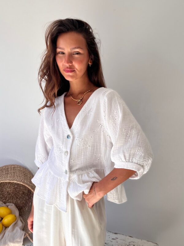 $22,500Descripción: Blusa de escote pico. Cierre delantero con botones. Bajo acabado en volantes.
