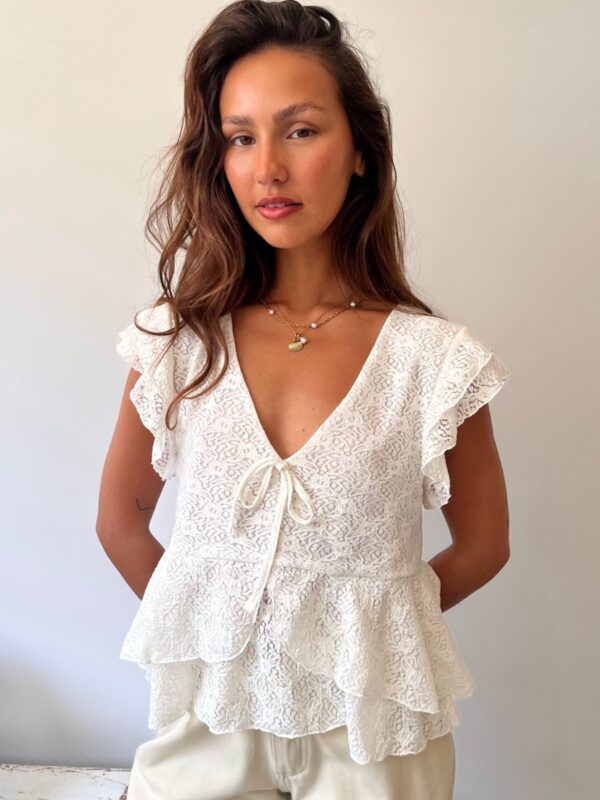 $18,500Descripción: Blusa de escote pico. Detalle de volantes. Lazo delantero regulable