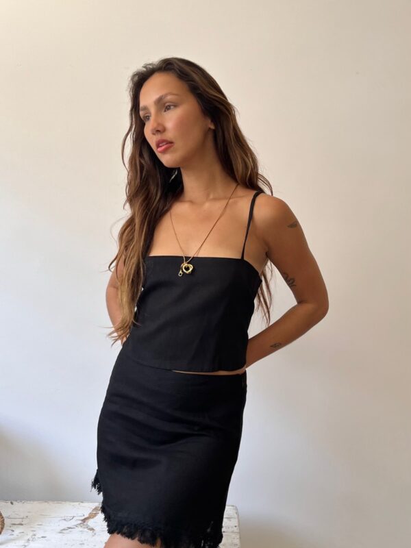 $19,000Descripción: mini de tiro alto con cierre metálico lateral. Detalle de puntilla con flecos en bajo.