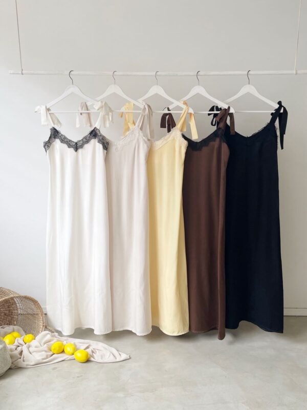 $28,000Descripción: Vestido largo de escote pico y tirantes para atar. Detalle de aplicación de encaje.