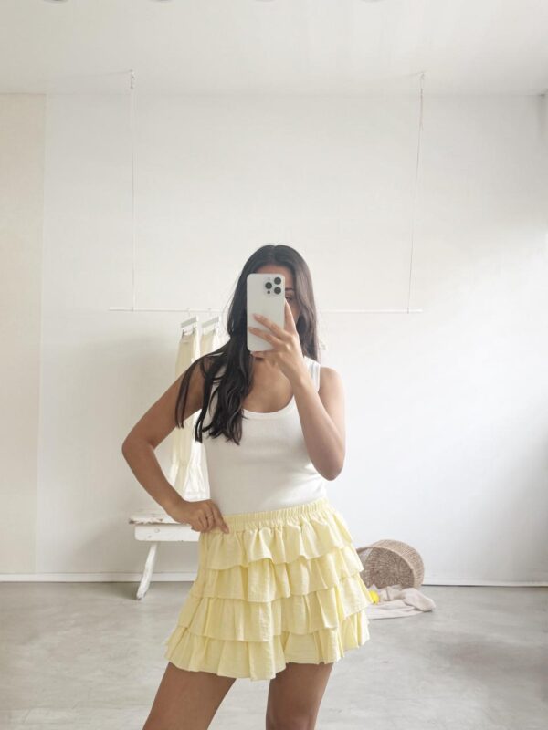 $18,500$14,800Descripción: Mini corta de tiro medio. Detalle de volados. Cintura elastizada.