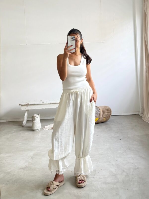 $27,000Descripción: Pantalón corte aladin con cintura elástizada. Detalle de cordón decorativo. Bajo con elástico interior y terminación de puntilla